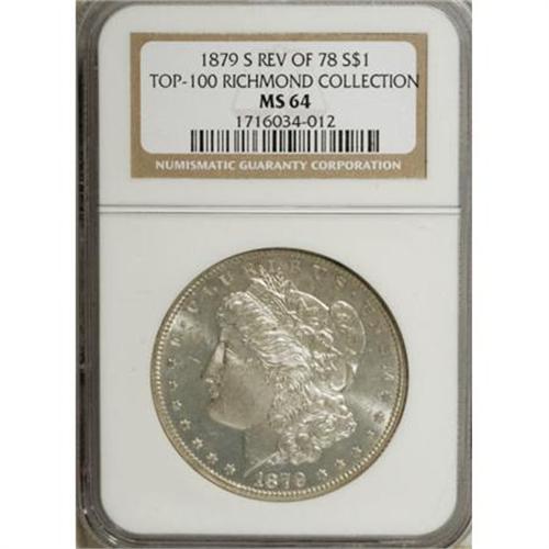 <B>1879-S $1 Reverse of 1878 MS64 NGC.</B></I> Ex: Richmond Collection. A Top 100 Variety. A boldly struck near-Gem with faint gold toning and a desirable provenance. The obverse is semi-prooflike, while cartwheel luster dazzles the reverse. The left obverse has only a few moderate marks.<BR><I>Ex: Richmond Collection, Part II (David Lawrence, 11/04), lot 1588.</B></I><BR><BR><B>Coin Engraver:</B> George T. Morgan<BR><BR><b>Shipping:</b> Coins & Currency (<a target="_blank" href="http://www.heritageauctions.com/common/shipping.php">view shipping information</a>)