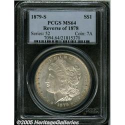 <B>1879-S<img border='0' src='http://www.heritagecoins.com/images/star.gif' width=10 height=10>$1 Reverse of 1878 MS64 PCGS.</B></I> A Top 100 Variety. A mildly prooflike piece with original cream-gray and golden-brown colors. Well preserved aside from the expected faint grazes on the cheek.