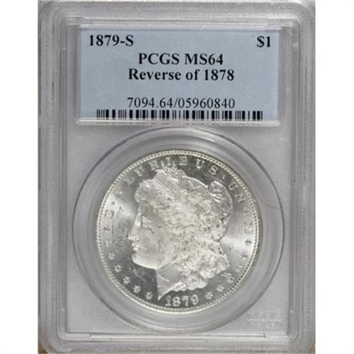 <B>1879-S $1 Reverse of 1878 MS64 PCGS.</B></I> Booming cartwheel luster and brilliant, snow-white surfaces are the hallmarks of this instantly appealing near-Gem. Well struck with a few scuff marks on Liberty's cheek and in the left obverse field that preclude a higher grade designation. <BR><BR><b>Shipping:</b> Coins & Currency (<a target="_blank" href="http://www.heritageauctions.com/common/shipping.php">view shipping information</a>)