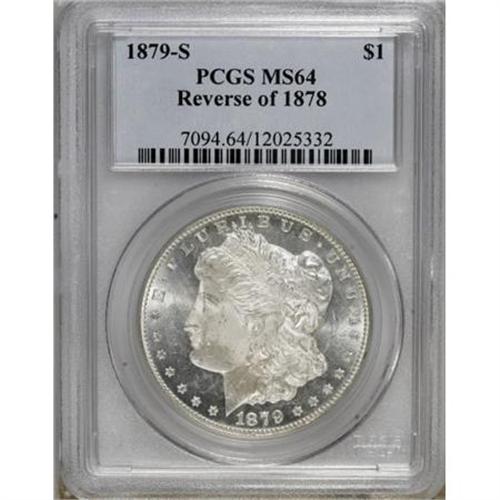 <B>1879-S $1 Reverse of 1878 MS64 PCGS.</B></I> The obverse of this gleaming Reverse of 1878 Choice dollar is distinctly prooflike, and the portrait shows rich frost. By contrast, the silver-white reverse has powerful cartwheel luster. PCGS has graded 46 finer pieces (1/08).<BR><BR><B>Coin Engraver:</B> George T. Morgan<BR><BR><b>Shipping:</b> Coins & Currency (<a target="_blank" href="http://www.heritageauctions.com/common/shipping.php">view shipping information</a>)