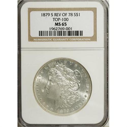 <B>1879-S $1 Reverse of 1878 MS65 NGC.</B></I> Top 100. A large number of Reverse of 1878 dollars were found in the Redfield hoard. While this greatly increased the availability of this variant, it also increased awareness of it and consequently also increased demand by even more collectors. Today, the Flat Breast 1879-S is an established variety in the Morgan series, and it is well known that high grade examples are very scarce. This Gem is fully struck and the surfaces are mostly brilliant with just the faintest hint of golden present on the denticles on the right side of the obverse. The reverse is fully prooflike.<BR><I>From the Reuben Reinstein Collection.</B></I><BR><BR><b>Shipping:</b> Coins & Currency (<a target="_blank" href="http://www.heritageauctions.com/common/shipping.php">view shipping information</a>)
