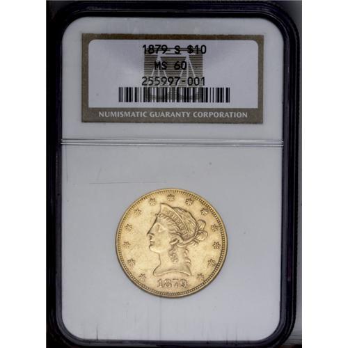 <B>1879-S<$10> MS60 NGC.</B></I> This honey-gold example is crisply struck and has good luster. Moderate abrasions are typical for the grade. The 1879-S is the most available S-mint issue from its decade, but is nonetheless scarce in Mint State.