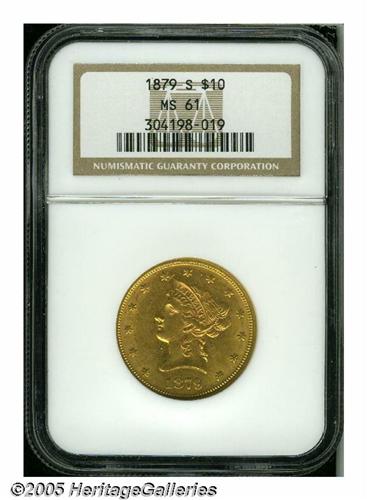 <B>1879-S<$10> MS61 NGC.</B></I> A crisply struck peach-gold scarcer date Liberty Ten. The luster is reasonable, and the eye appeal is good due to the absence of heavy marks. Population: 46 in 61, 7 finer (4/05).