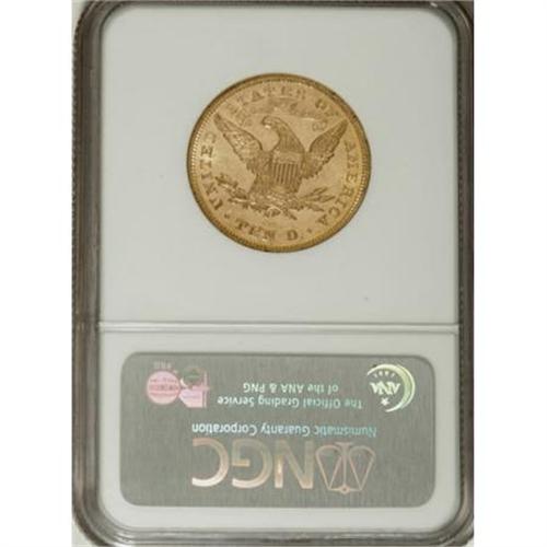 <B>1879-S $10 MS61 NGC.</B></I> A moderately scarce date, with the typical example falling into the AU50 to AU58 grade range, and only a few dozen examples certified in Mint State. Peach-gold surfaces exhibit sharply struck design elements on this MS61 specimen, and the most potent luster occurs in the areas around and the interstices of the design elements. Tiny marks evenly scattered about define the grade.<BR><BR><B>Coin Engraver:</B> Christian Gobrecht<BR><BR><b>Shipping:</b> Coins & Currency (<a target="_blank" href="http://www.heritageauctions.com/common/shipping.php">view shipping information</a>)