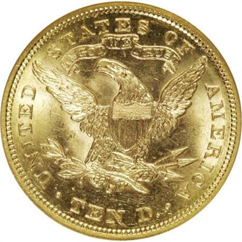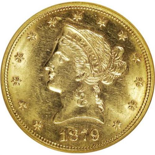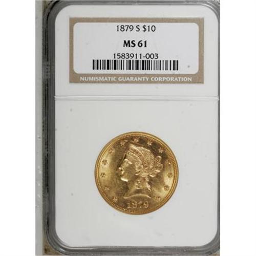 <B>1879-S $10 MS61 NGC.</B></I> NGC Census: (58/11). PCGS Population (20/20). Mintage: 224,000. Numismedia Wsl. Price for NGC/PCGS coin in MS61: $1,125. (#8686)<BR><BR><B>Coin Engraver:</B> Christian Gobrecht<BR><BR><b>Shipping:</b> Coins & Currency (<a target="_blank" href="http://www.heritageauctions.com/common/shipping.php">view shipping information</a>)