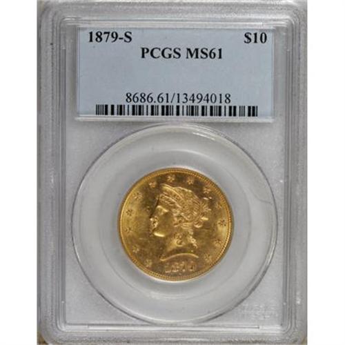 <B>1879-S $10 MS61 PCGS.</B></I> An attractive example of this conditionally scarce issue. Luster extends into the open fields, and the strike is penetrating. There are no detracting marks. Population: 20 in 61, 20 finer (7/07).<BR><BR><B>Coin Engraver:</B> Christian Gobrecht<BR><BR><b>Shipping:</b> Coins & Currency (<a target="_blank" href="http://www.heritageauctions.com/common/shipping.php">view shipping information</a>)