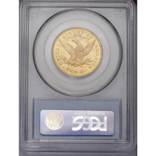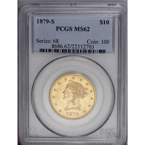 <B>1879-S $10 MS62 PCGS.</B></I> A pinpoint-sharp piece with complete luster and only faint slide marks on the fields. A reeding mark on the cheek provides the sole detraction. The 1879-S is rare but collectible in Mint State, unlike prior S-mint issues. Population: 11 in 62, 3 finer (1/06).