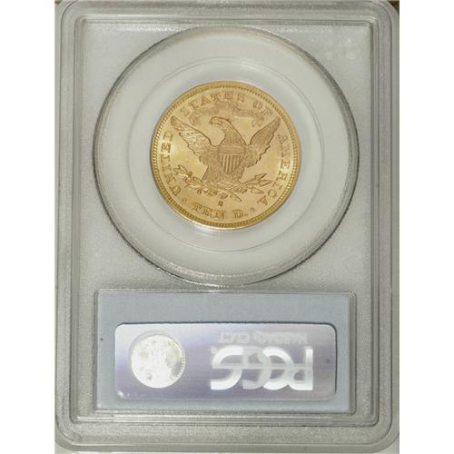 <B>1879-S $10 MS62 PCGS.</B></I> The 1879-S is the most available S-mint eagle from its decade, but is nonetheless a rarity at the MS62 level. A few field marks and a slender horizontal abrasion on the shield are all that limit the grade. Population: 12 in 62, 3 finer (10/06).<BR><BR><b>Shipping:</b> Coin/Currency (<a target="_blank" href="http://www.heritageauctions.com/common/shipping.php">view shipping information</a>)