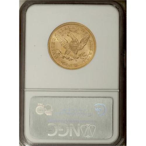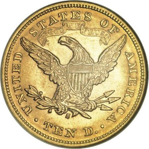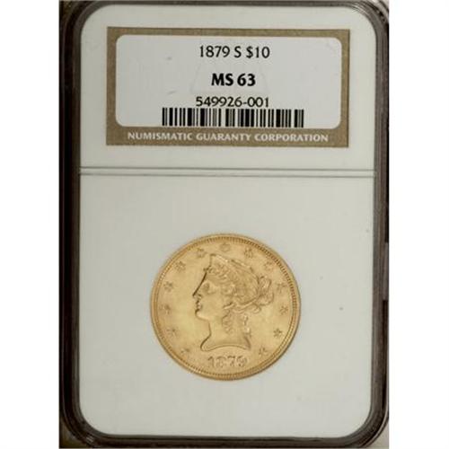 <B>1879-S $10 MS63 NGC.</B></I> The NGC Census Report paints a clear picture regarding the condition rarity of this issue. Only three coins have been certified as MS63 with none grading finer (12/07). This example boasts amber-gold coloration over satiny, lustrous surfaces. Fierce bidding competition is expected on this high grade 1879-S ten.<BR><BR><B>Coin Engraver:</B> Christian Gobrecht<BR><BR><b>Shipping:</b> Coins & Currency (<a target="_blank" href="http://www.heritageauctions.com/common/shipping.php">view shipping information</a>)