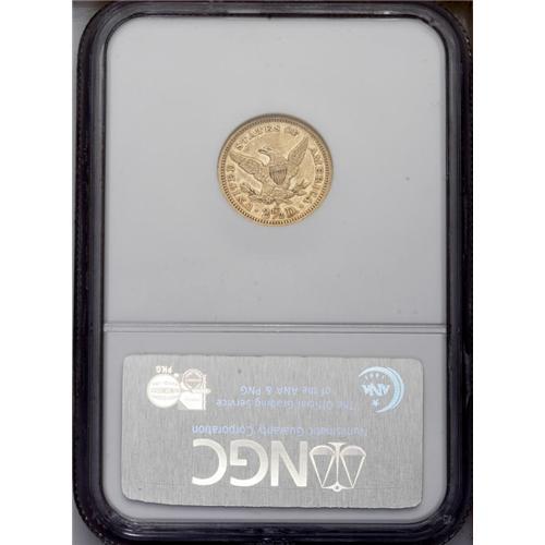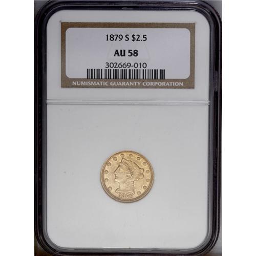 <B>1879-S $2 1/2 AU58 NGC.</B></I> Light yellow surfaces with satiny luster. The reverse of this near-Mint example is slightly prooflike in appearance. This is Breen's "wide, squat S" variety, with the mintmark almost perfectly square.
