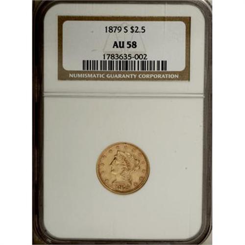 <B>1879-S $2 1/2 AU58 NGC.</B></I> A bright and glossy example with plentiful luster and pleasing rose-gold surfaces. The fields, especially on the reverse, display glimpses of reflectivity and the overall look is very appealing. Although it is not an especially low mintage issue, the 1879-S is extremely scarce in Mint State.<BR><BR><B>Coin Engraver:</B> Christian Gobrecht<BR><BR><b>Shipping:</b> Coins & Currency (<a target="_blank" href="http://www.heritageauctions.com/common/shipping.php">view shipping information</a>)