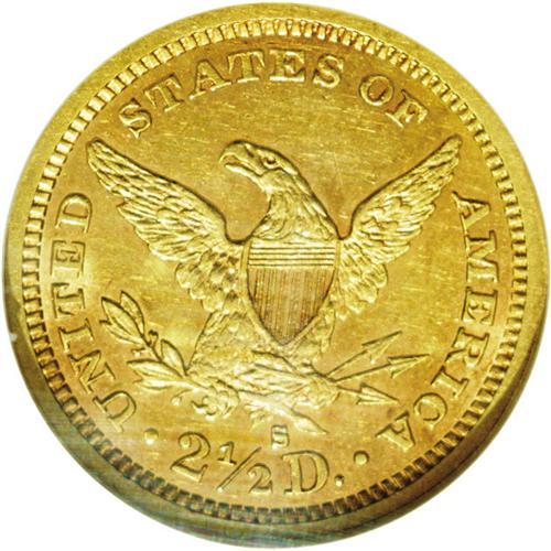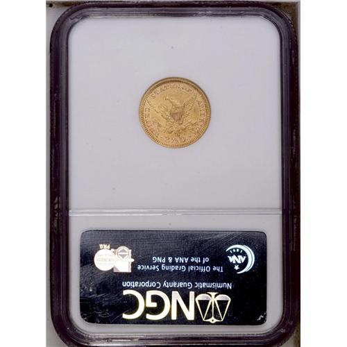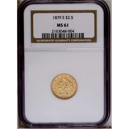 <B>1879-S<$2 1/2> MS61 NGC.</B></I> This lower mintage issue has surprisingly few Uncirculated survivors, and it is unusual that one auction would have two such pieces. This example has bright prooflike fields on each side and the surfaces are draped with light reddish patina. Fully struck on the obverse; the only mentionable area of weakness on the reverse is on the eagle's left (facing) leg. Numerous small abrasions account for the grade, and there is a shallow planchet flaw between stars 1 and 2. <BR><BR><B>Important notice:</B> Heritage usually auctions material at the rate of 200-250 lots per hour. On some occasions eBay Live bid software or the Internet may not be able to keep up with the pace of the auction. We recommend placing a realistic absentee bid now as insurance to avoid disappointment. Occasionally the auctioneer may eliminate or reject an eBay Live bid, and the auctioneer may also reopen a lot after the close of the eBay live bidding (usually because we missed an audience bid), and may reject your bid even if it shows you as the winning bidder. By bidding via eBay Live, you agree that Heritage may award the lot to another bidder at its sole discretion under the circumstances described above or any other reasonable circumstances. Since eBay bids are not shown to us until we open the lot on the floor, we treat those bids just like floor bids. In most cases the floor responds before the eBay bid is presented to us, due to Internet lag time, so for consistency we have made it a policy that floor bids are always considered first over tie eBay live bids. Also please note that all Heritage lots purchased through eBay Live carry a 20% Buyer's Premium. Please make sure you read the Terms and Conditions before you bid. This lot is being auctioned in conjunction with a live floor auction by Heritage Galleries & Auctioneers. All final auction and invoice information will be supplied by Heritage Galleries & Auctioneers, and all other information should be considered preliminary. Lot:2435 <BR><BR><B>Winning Notification and Billing:</B> After the FINAL session in this auction is complete, Heritage will send e-mail and snail mail invoices. This process normally takes several days. All final auction and invoice information will be supplied by Heritage Galleries & Auctioneers, and all other information should be considered preliminary. <BR><BR>This auction will be conducted on a live auction floor and over the Internet through eBay Live. If you choose to place an absentee bid, please take a moment to <font color='#0000ff'><u><a href='http://pages.ebay.com/liveauctions/help/before/laabsentee.html'>learn how eBay Live absentee bidding works</a></u></font><font color='#000000'>