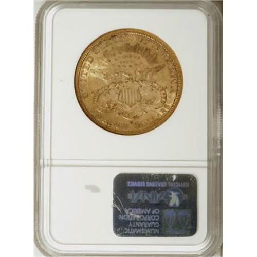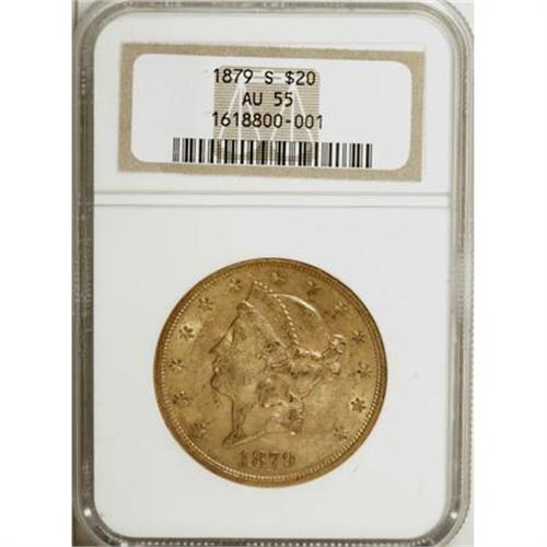 <B>1879-S $20 AU55 NGC.</B></I> NGC Census: (115/834). PCGS Population (105/453). Mintage: 1,233,800. Numismedia Wsl. Price for NGC/PCGS coin in AU55: $796. (#8991)<BR><BR><B>Coin Engraver:</B> James B. Longacre<BR><BR><b>Shipping:</b> Coins & Currency (<a target="_blank" href="http://www.heritageauctions.com/common/shipping.php">view shipping information</a>)