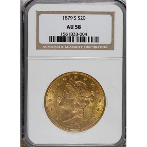 1879-S $20 AU58 NGC. NGC Census: (535/283). PCGS P