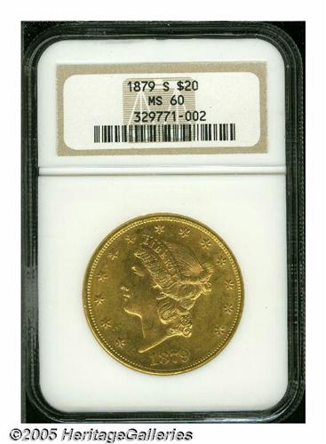 <B>1879-S<$20> MS60 NGC.</B></I> Fully lustrous with pleasing light greenish-yellow color and accents of light rose toning. The surfaces have a slightly satiny appearance. Overall, this is a wonderful example for the grade, with only minor abrasions.<BR><I>From The Stig Ericsson Collection.</B></I>