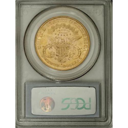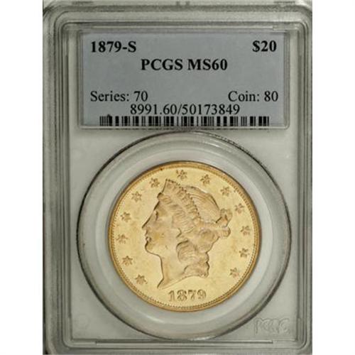 <B>1879-S $20 MS60 PCGS.</B></I> Amazingly lustrous, with semi-reflective surfaces that have a flashiness that even the presence of hundreds of minor marks cannot diminish. Both the obverse and reverse are equally abraded, but in terms of flash and sparkle, this twenty is exciting.<BR><BR><B>Coin Engraver:</B> James B. Longacre<BR><BR><b>Shipping:</b> Coins & Currency (<a target="_blank" href="http://www.heritageauctions.com/common/shipping.php">view shipping information</a>)