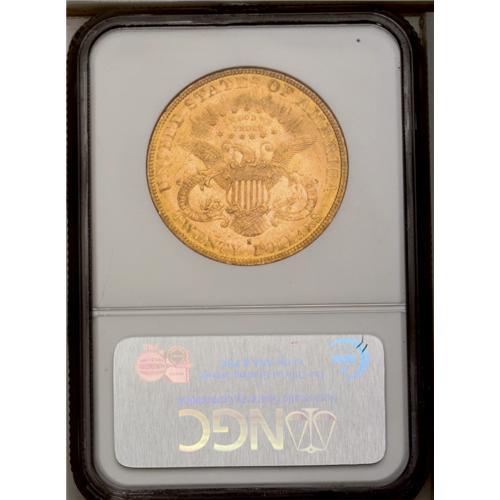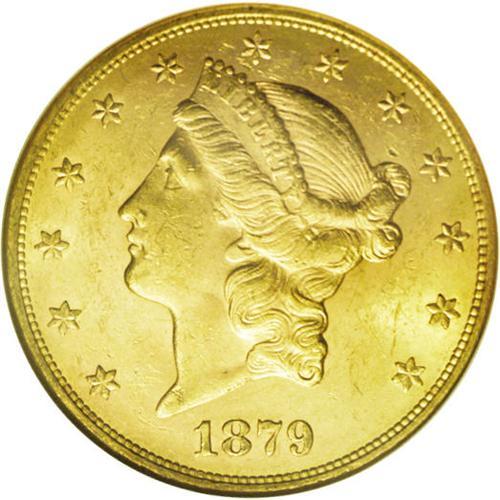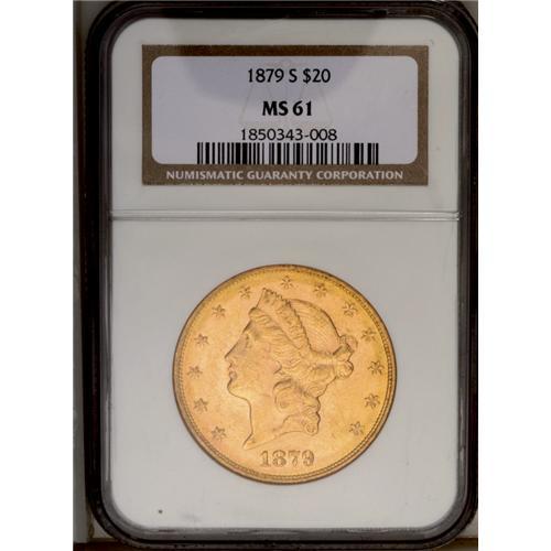 <B>1879-S<$20> MS61 NGC.</B></I> The 1879-S is scarce in the lower Uncirculated grades. This MS61 specimen is crisply struck on the design elements, and is enveloped in honey-gold patina that displays whispers of light tan. The luster flow on the lightly abraded surfaces is nearly unbroken