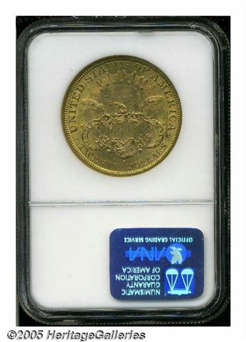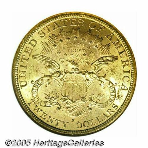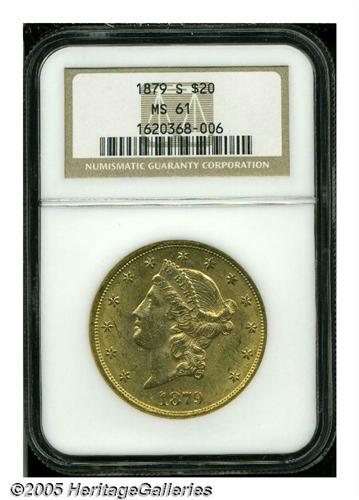<B>1879-S<$20> MS61 NGC.</B></I> The '79-S becomes scarce in AU grades, and very scarce in lower Uncirculated condition. Choice and Gem examples are rare. The current MS61 specimen displays bright honey-gold patina with luster in the areas around, and in the interstices of, the devices. The design elements are adequately struck throughout. Numerous contact marks are scattered about, the most noticeable occurring on Liberty's cheek and neck. NGC and PCGS together have certified 72 coins finer (5/05).