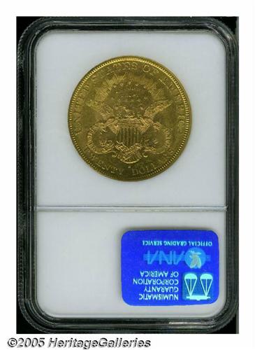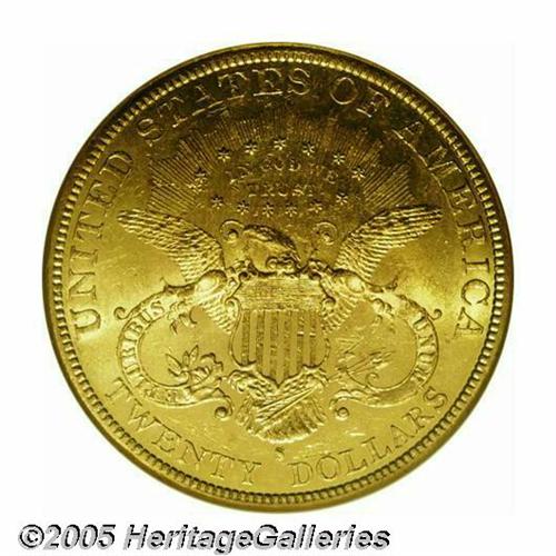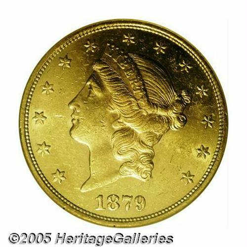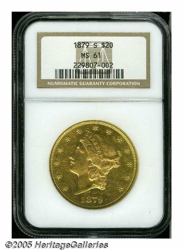<B>1879-S<$20> MS61 NGC.</B></I> Typically bagmarked, particularly on the obverse, this coin retains its original, bright mint luster. In fact, the fields impart a partially reflective sheen. Some green-gold patina has formed on each side.