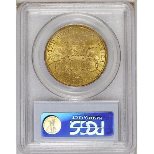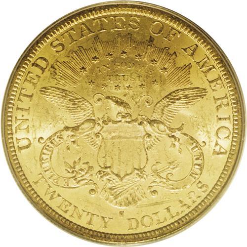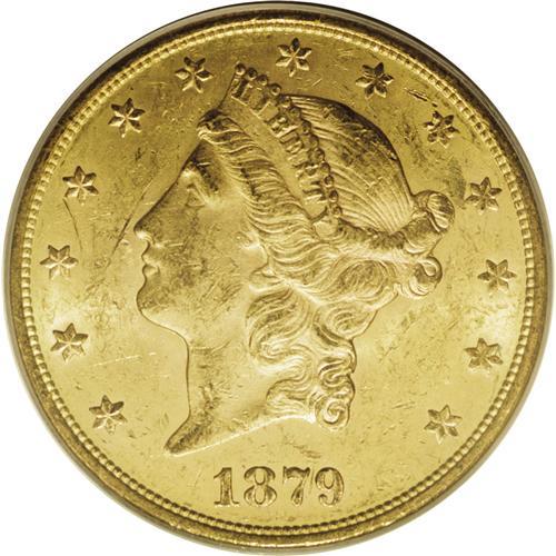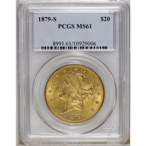 <B>1879-S $20 MS61 PCGS.</B></I> Well struck with a bright, pleasing appearance. Rich yellow-gold coloration adds to the eye appeal of the piece. Moderately reflective prooflike fields are observed on the obverse, which tend to 'magnify' the typical small abrasions found at this grade level. An issue rarely encountered in Mint State, this example is, nonetheless, lustrous and appealing.<BR><BR><b>Shipping:</b> Coin/Currency (<a target="_blank" href="http://www.heritageauctions.com/common/shipping.php">view shipping information</a>)