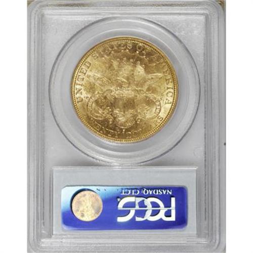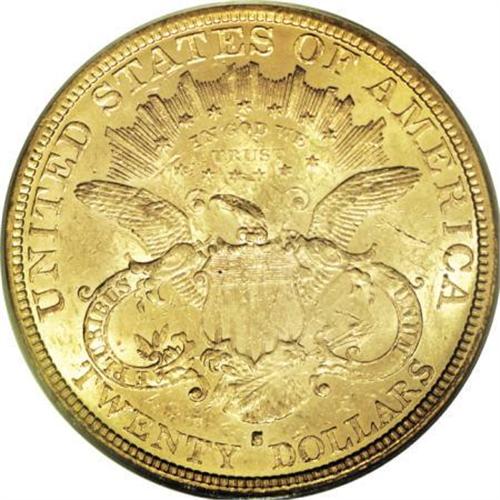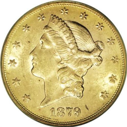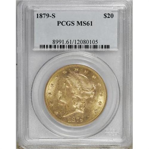 <B>1879-S $20 MS61 PCGS.</B></I> Many 1879-S twenties were shipped overseas, and returning examples are mostly Extremely Fine or About Uncirculated. This MS61 piece displays well struck design elements and lustrous greenish-gold surfaces. A number of small abrasions are visible over both sides.<BR><BR><B>Coin Engraver:</B> James B. Longacre<BR><BR><b>Shipping:</b> Coins & Currency (<a target="_blank" href="http://www.heritageauctions.com/common/shipping.php">view shipping information</a>)