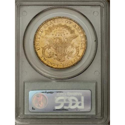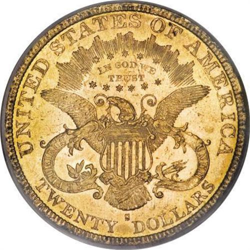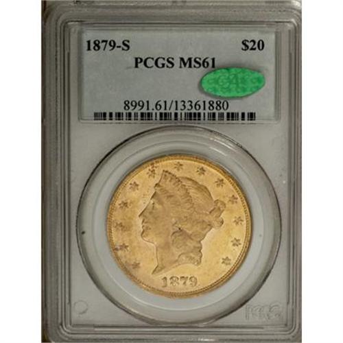 <B>1879-S $20 MS61 PCGS. CAC.</B></I> Bright and flashy, with prooflike fields and attractive light khaki coloration, this piece shows uniformly bold definition, with only the first obverse star displaying minor weakness. This is a conditionally scarce issue in Mint State, and only 85 examples have been graded finer than MS61, by NGC and PCGS combined (11/07). <BR><BR><B>Coin Engraver:</B> James B. Longacre<BR><BR><b>Shipping:</b> Coins & Currency (<a target="_blank" href="http://www.heritageauctions.com/common/shipping.php">view shipping information</a>)