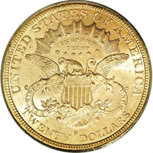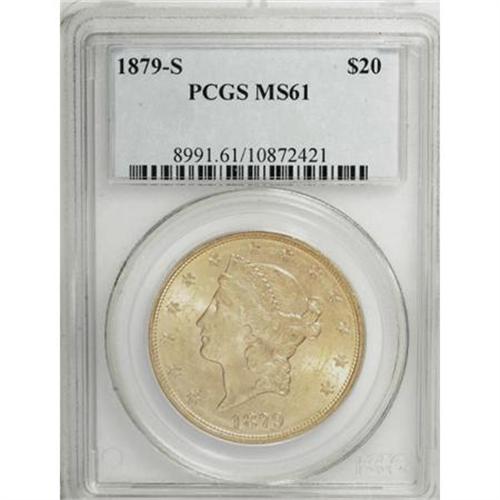 <B>1879-S $20 MS61 PCGS.</B></I> Despite myriad light to moderate marks on the yellow-gold surfaces, this Type Three S-mint twenty retains significant eye appeal, largely thanks to its strong luster and impressive detail. Despite a high mintage and significant repatriation over the last 50 years, this issue is hardly common in Mint State, as noted by Garrett and Guth (2006).<BR><BR><B>Coin Engraver:</B> James B. Longacre<BR><BR><b>Shipping:</b> Coins & Currency (<a target="_blank" href="http://www.heritageauctions.com/common/shipping.php">view shipping information</a>)