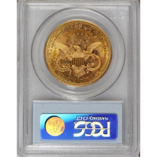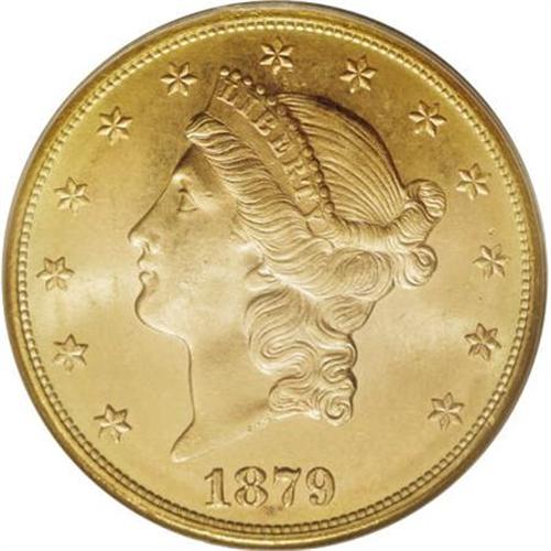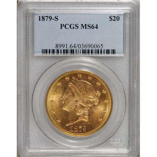 <B>1879-S $20 MS64 PCGS.</B></I> While the 1879-S as a date is not generally thought of as rare, like a long list of Liberty Head double eagles in high grade, it is conditionally quite elusive. Unlike most Liberty Head double eagles, however, it is rare in any Mint State grade. The issue in the past has been underrated, due to its large emission exceeding 1.2 million pieces, but <I>in grades above MS62 the issue is surpassingly rare. The present example is the single highest graded of the issue at either NGC or PCGS, and it is the finest by two grade points that we have ever had the privilege of offering.<BR></B></I> The current NGC and PCGS population data eloquently tell the story: While NGC has certified 33 pieces in MS62, there is not a single piece graded MS63, much less one in MS64. (Even the 1897-S's sibling, the famously rare 1879-O double eagle with a mintage of 2,325 pieces, shows one example graded MS63 at NGC.) PCGS has certified 44 examples of the 1879-S in MS62, yet there are only three specimens certified MS63 (or--as always--one piece submitted three times). Finally, in MS64, the present example is the only one so certified.<BR> Once considered a common Type Three double eagle, the 1879-S in recent years has seen a burgeoning awareness of its true rarity in the numismatic marketplace. Heritage has offered a total of only 11 MS62 examples of the 1879-S in the past dozen or so years. While in the mid-1990s the selling price was only slightly higher than generic pieces, 10 years later the average price for an MS62 had increased fifteenfold. In 2004's <I>Type Three Double Eagles 1877-1907,</B></I> the authors made the following observations: "The 1879-S Double Eagle can be located in any circulated grade without much difficulty although nice About Uncirculated coins are not nearly as common as their current price level would indicate. This is a scarce date in Uncirculated with a great majority of the known specimens grading Mint State-60. It becomes rare in Mint State-61 and any 1879-S Double Eagle grading Mint State-62 or better is very rare."<BR> Bowers' <I> Guide Book of Double Eagles</B></I> probably understates the elusiveness of the issue in MS62 by saying, "The 1879-S is another easy winner in the double eagle sweepstakes--with examples being readily available in just about any grade desired from VF to MS-62. Higher level coins are in another category, however, and are very elusive." Of course, on the latter point he is absolutely correct.<BR> The latest (and most encyclopedic) gold coin reference available, Jeff Garrett and Ron Guth's <I>Encyclopedia of U.S. Gold Coins 1795-1933,</B></I> offers the following comments: "Although the mintage for the 1879 New Orleans issue was tiny, the San Francisco Mint produced an abundant number of coins. Many were shipped overseas for international trade. Large numbers have returned in recent decades. Most are just Extremely Fine or About Uncirculated, and the issue is actually scarce in Mint State. In choice condition the 1879-S double eagle is very rare. Some high-grade examples seen are partially prooflike. Amazingly, two NGC MS-62 examples sold for more than $29,000 each in early 2005."<BR> The present example boasts a bold strike, with full radial details seen on each peripheral star, and none of the mentionable weakness so often seen on the highpoints of Liberty's hair. The surfaces offer intense luster over medium orange-gold surfaces that show a hint of reflectivity in the fields. For such a large gold coin, the surfaces are remarkably free of all but a few smallish abrasions that are consistent with the near-Gem grade level. This beautiful and rare coin is bound to catch the attention of Registry Set collectors and connoisseurs of the finest rare-date gold. Population: 1 in 64; there are none finer (6/07).<BR><BR><b>Shipping:</b> Coins & Currency (<a target="_blank" href="http://www.heritageauctions.com/common/shipping.php">view shipping information</a>)