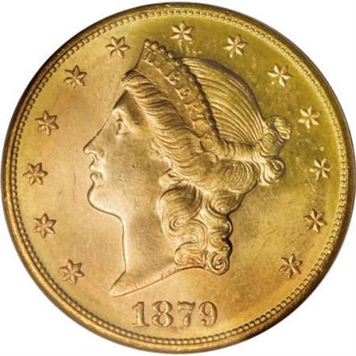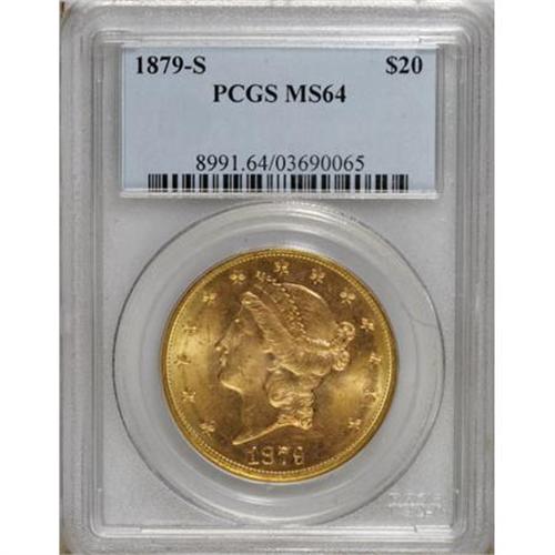 <B>1879-S $20 MS64 PCGS.</B></I> While the 1879-S as a date is not generally thought of as rare, like a long list of Liberty Head double eagles in high grade, it is conditionally quite elusive. Unlike most Liberty Head double eagles, however, it is rare in any Mint State grade. The issue in the past has been underrated, due to its large emission exceeding 1.2 million pieces, but <I>in grades above MS62 the issue is surpassingly rare. The present example is the single highest graded of the issue at either NGC or PCGS, and it is the finest by two grade points that we have ever had the privilege of offering.<BR></B></I> The current NGC and PCGS population data eloquently tell the story: While NGC has certified 36 pieces in MS62, there is not a single piece graded MS63, much less one in MS64. (Even the 1897-S's sibling, the famously rare 1879-O double eagle with a mintage of 2,325 pieces, shows one example graded MS63 at NGC.) PCGS has certified 45 examples of the 1879-S in MS62, yet there are only three specimens certified MS63 (or--as always--one piece submitted three times). Finally, in MS64, the present example is the only one so certified.<BR> Once considered a common Type Three double eagle, the 1879-S in recent years has seen a burgeoning awareness of its true rarity in the numismatic marketplace. Heritage has offered a total of only 11 MS62 examples of the 1879-S in the past dozen or so years. While in the mid-1990s the selling price was only slightly higher than generic pieces, 10 years later the average price for an MS62 had increased fifteenfold. In 2004's <I>Type Three Double Eagles 1877-1907,</B></I> the authors made the following observations: "The 1879-S Double Eagle can be located in any circulated grade without much difficulty although nice About Uncirculated coins are not nearly as common as their current price level would indicate. This is a scarce date in Uncirculated with a great majority of the known specimens grading Mint State-60. It becomes rare in Mint State-61 and any 1879-S Double Eagle grading Mint State-62 or better is very rare."<BR> Bowers' <I> Guide Book of Double Eagles</B></I> probably understates the elusiveness of the issue in MS62 by saying, "The 1879-S is another easy winner in the double eagle sweepstakes--with examples being readily available in just about any grade desired from VF to MS-62. Higher level coins are in another category, however, and are very elusive." Of course, on the latter point he is absolutely correct.<BR> The latest (and most encyclopedic) gold coin reference available, Jeff Garrett and Ron Guth's <I>Encyclopedia of U.S. Gold Coins 1795-1933,</B></I> offers the following comments: "Although the mintage for the 1879 New Orleans issue was tiny, the San Francisco Mint produced an abundant number of coins. Many were shipped overseas for international trade. Large numbers have returned in recent decades. Most are just Extremely Fine or About Uncirculated, and the issue is actually scarce in Mint State. In choice condition the 1879-S double eagle is very rare. Some high-grade examples seen are partially prooflike. Amazingly, two NGC MS-62 examples sold for more than $29,000 each in early 2005."<BR> The present example boasts a bold strike, with full radial details seen on each peripheral star, and none of the mentionable weakness so often seen on the highpoints of Liberty's hair. The surfaces offer intense luster over medium orange-gold surfaces that show a hint of reflectivity in the fields. For such a large gold coin, the surfaces are remarkably free of all but a few smallish abrasions that are consistent with the near-Gem grade level. This beautiful and rare coin is bound to catch the attention of Registry Set collectors and connoisseurs of the finest rare-date gold. Population: 1 in 64; there are none finer (8/07).<BR><BR><B>Coin Engraver:</B> James B. Longacre<BR><BR><b>Shipping:</b> Coins & Currency (<a target="_blank" href="http://www.heritageauctions.com/common/shipping.php">view shipping information</a>)