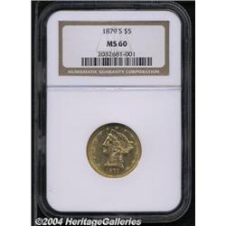 <B>1879-S<$5> MS60 NGC.</B></I> A boldly struck Half Eagle with extensive bright luster and a clean portrait. The obverse field has the numerous minor marks to be expected of the grade. A conditionally scarce issue. <BR><BR><B>Important notice:</B> Heritage usually auctions material at the rate of 200-250 lots per hour. On some occasions eBay Live bid software or the Internet may not be able to keep up with the pace of the auction. We recommend placing a realistic absentee bid now as insurance to avoid disappointment. Occasionally the auctioneer may eliminate or reject an eBay Live bid, and the auctioneer may also reopen a lot after the close of the eBay live bidding (usually because we missed an audience bid), and may reject your bid even if it shows you as the winning bidder. By bidding via eBay Live, you agree that Heritage may award the lot to another bidder at its sole discretion under the circumstances described above or any other reasonable circumstances. Since eBay bids are not shown to us until we open the lot on the floor, we treat those bids just like floor bids. In most cases the floor responds before the eBay bid is presented to us, due to Internet lag time, so for consistency we have made it a policy that floor bids are always considered first over tie eBay live bids. Also please note that all Heritage lots purchased through eBay Live carry a 20% Buyer's Premium. Please make sure you read the Terms and Conditions before you bid.