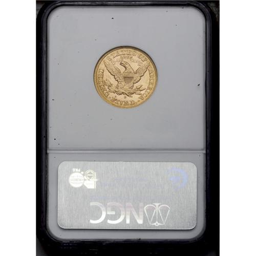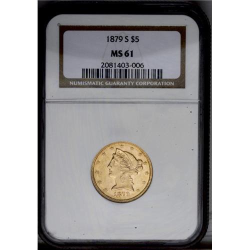 <B>1879-S<$5> MS61 NGC.</B></I> The highly lustrous golden-yellow surfaces are pleasing and well struck, but there are too many small abrasions and light scrapes to qualify for the next level. The eagle is surprisingly well detailed, with no apparent weakness on the claws, fletchings, or wing feathers. Census: 56 in 61, 63 finer (3/06). <BR><BR><B>Important notice:</B> Heritage usually auctions material at the rate of 200-250 lots per hour. On some occasions eBay Live bid software or the Internet may not be able to keep up with the pace of the auction. We recommend placing a realistic absentee bid now as insurance to avoid disappointment. Occasionally the auctioneer may eliminate or reject an eBay Live bid, and the auctioneer may also reopen a lot after the close of the eBay live bidding (usually because we missed an audience bid), and may reject your bid even if it shows you as the winning bidder. By bidding via eBay Live, you agree that Heritage may award the lot to another bidder at its sole discretion under the circumstances described above or any other reasonable circumstances. Since eBay bids are not shown to us until we open the lot on the floor, we treat those bids just like floor bids. In most cases the floor responds before the eBay bid is presented to us, due to Internet lag time, so for consistency we have made it a policy that floor bids are always considered first over tie eBay live bids. Also please note that all Heritage lots purchased through eBay Live carry a 20% Buyer's Premium. Please make sure you read the Terms and Conditions before you bid. This lot is being auctioned in conjunction with a live floor auction by Heritage Galleries & Auctioneers. All final auction and invoice information will be supplied by Heritage Galleries & Auctioneers, and all other information should be considered preliminary. Lot:2800 <BR><BR><B>Winning Notification and Billing:</B> After the FINAL session in this auction is complete, Heritage will send e-mail and snail mail invoices. This process normally takes several days. All final auction and invoice information will be supplied by Heritage Galleries & Auctioneers, and all other information should be considered preliminary. <BR><BR>This auction will be conducted on a live auction floor and over the Internet through eBay Live. If you choose to place an absentee bid, please take a moment to <font color='#0000ff'><u><a href='http://pages.ebay.com/liveauctions/help/before/laabsentee.html'>learn how eBay Live absentee bidding works</a></u></font><font color='#000000'>