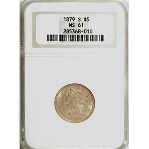 <B>1879-S $5 MS61 NGC.</B></I> NGC Census: (63/70). PCGS Population (22/67). Mintage: 426,200. Numismedia Wsl. Price for NGC/PCGS coin in MS61: $775. (#8350)<BR><BR><B>Coin Engraver:</B> Christian Gobrecht<BR><BR><b>Shipping:</b> Coins & Currency (<a target="_blank" href="http://www.heritageauctions.com/common/shipping.php">view shipping information</a>)
