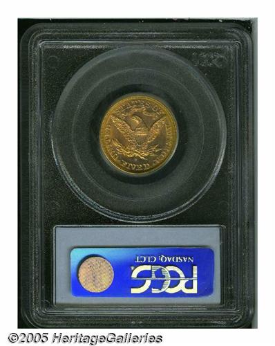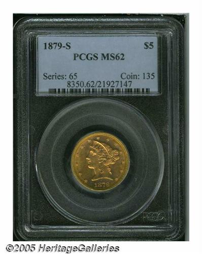 <B>1879-S<$5> MS62 PCGS.</B></I> This flashy '79-S displays two shades of pleasing deep orange-gold patina overlying lustrous surfaces. The design elements are nicely struck, adding a certain appeal to the coin. Moderate abrasions on Liberty's jaw, and lighter marks scattered over the obverse, are all that separate this piece from a significantly higher grade.