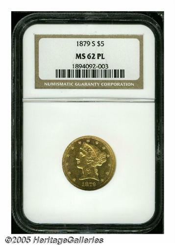 <B>1879-S<$5> MS62 Prooflike NGC.</B></I> A nicely struck representative that has decent luster and no unpleasant marks. A scarce issue in Mint State, and undoubtedly very difficult to locate with moderately prooflike fields. Population: 1 in 62 Prooflike, 1 finer (4/05).