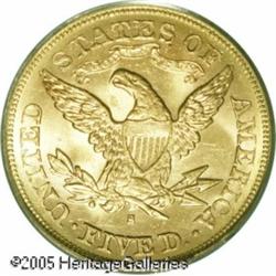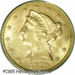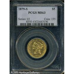 <B>1879-S $5 MS63 PCGS.</B></I> Bright and satiny with ample mint frost over the central devices. Despite a mintage 426,200 pieces, high demand for gold coinage in the Far West helped reduce the number of Mint State survivors to only a few hundred pieces. Select and better coins such as this are especially scarce. Population: 14 in 63, 10 finer (1/05). Lot:7848