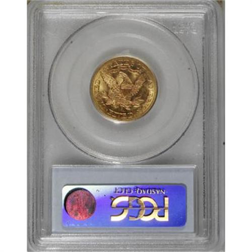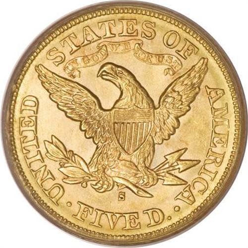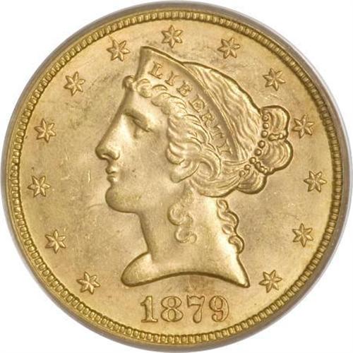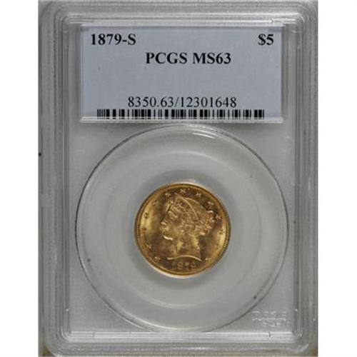 <B>1879-S $5 MS63 PCGS.</B></I> The 1879-S five dollar is relatively common in circulated grades, but Mint State examples are elusive; Gem coins are virtually unavailable. The yellow-gold surfaces of this Select example are subtly laced with mint-green, and possess nice luster. A well executed strike leaves strong definition on the design elements, and a few minute marks define the grade.<BR><BR><B>Coin Engraver:</B> Christian Gobrecht<BR><BR><b>Shipping:</b> Coins & Currency (<a target="_blank" href="http://www.heritageauctions.com/common/shipping.php">view shipping information</a>)