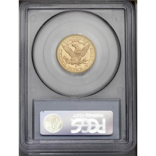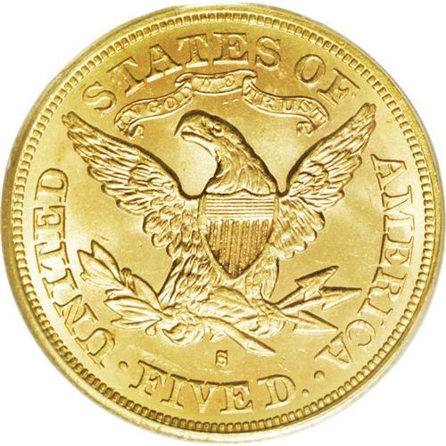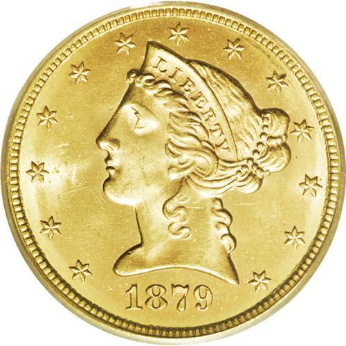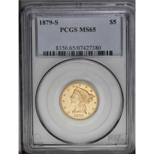 <B>1879-S $5 MS65 PCGS.</B></I> A surprisingly difficult coin to find in Mint State, despite a relatively hefty mintage of 426,200 pieces. This example is quite flashy and well struck, with a pleasing bright sheen and lovely light coloration. The carefully preserved surfaces are surprisingly clean for the issue and, in fact, this is the single finest certified 1879-S, the only example graded MS65 by either PCGS or NGC with none finer (10/06). For pedigree purposes, we note thin marks inconspicuously placed near star 9 and the FI in FIVE and concealed on each side of the shield border. The importance of the present offering to the advanced Liberty gold collector requires no further elaboration.<BR><BR><b>Shipping:</b> Coin/Currency (<a target="_blank" href="http://www.heritageauctions.com/common/shipping.php">view shipping information</a>)