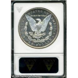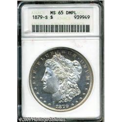 <B>1879-S<img border='0' src='http://www.heritagecoins.com/images/star.gif' width=10 height=10>$1 MS65 Deep Mirror Prooflike ANACS.</B></I> Sharply defined motifs are nicely contrasted against the deeply mirrored fields. Nearly untoned, save for a whisper of faint lilac color at the peripheries. Lot:9953