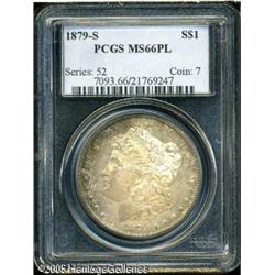 <B>1879-S<img border='0' src='http://www.heritagecoins.com/images/star.gif' width=10 height=10>$1 MS66 Prooflike PCGS.</B></I> Medium golden-gray patina rests over lustrous surfaces that exhibit noticeable field to device contrast. The design features are well struck throughout. Lot:9951