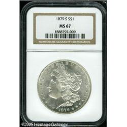 <B>1879-S<img border='0' src='http://www.heritagecoins.com/images/star.gif' width=10 height=10>$1 MS67 NGC.</B></I> Sharply struck with brilliant silver luster and frosty surfaces. A Superb Gem quality example for your collecting consideration. Lot:9949