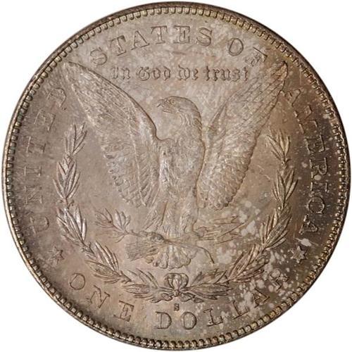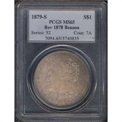 <b>1879-S Morgan Dollar. Reverse of 1878. PCGS graded MS65.</b> Lustrous fields ripple with original mint bloom underneath medium to deep toning. Against this are set nicely subdued, matte design elements. A solidly graded example, this coin displays above-average striking definition even for a dollar from this branch mint. This is to say that the strike is complete, not even a single fused hair strand over Liberty's ear to keep this coin from being full <b>(PCGS # 7094)</b>
