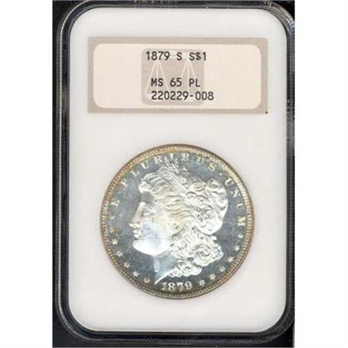 <b>1879-S Morgan Dollar. Reverse of 1879. NGC graded MS65 PL.</b> Extra frosty luster caps the devices on both sides, while pools of watery reflection lap against them from the smooth fields <b>(PCGS # 7093)</b>