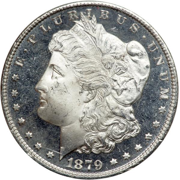 1879-S Morgan Dollar. Reverse of 1879. NGC graded MS-66. A nice white coin with prooflike surfaces only on the obverse the contrast is heightened by the pure-as-snow brilliance on the devices (PCGS # 7092) .