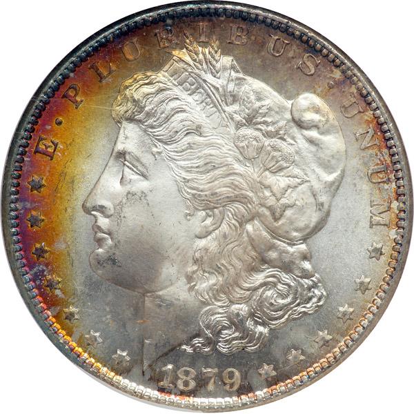 1879-S Morgan Dollar. Reverse of 1879. NGC graded MS-67 Star. Lovely partial golden toning on the obverse, silvery white exposed elsewhere. The San Francisco Mint dates in 1878-82 have some of the brightest, loveliest luster of all in this series. This coin exemplifies the quality one hopes to acquire (PCGS # 7092) .