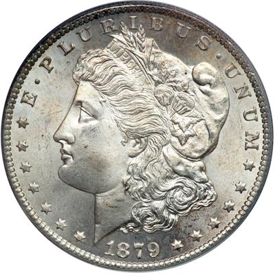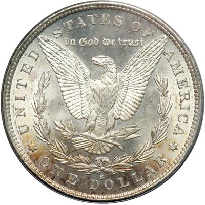 1879-S Morgan Dollar. Reverse of 1879. PCGS graded MS-67. A hint of light gold toning however mostly superb white, should attract spirited bidding. Well struck (PCGS # 7092).