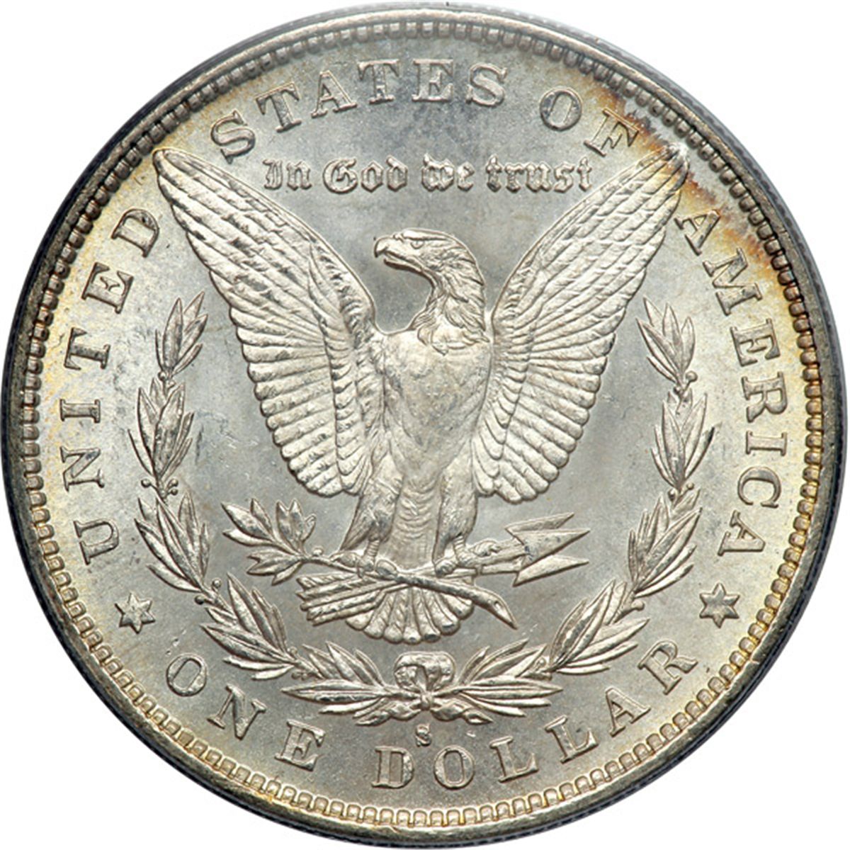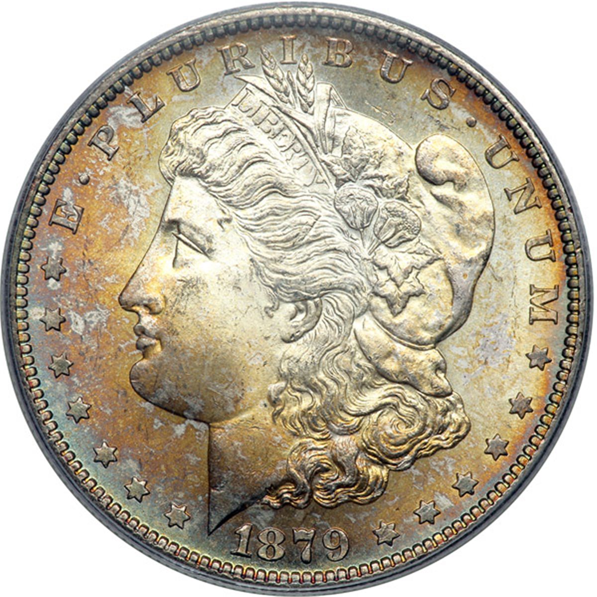 1879-S Morgan Dollar. Reverse of 1879. PCGS graded MS-66+. Lovely obverse rainbow toning on this boldly made Gem (PCGS # 7092) .