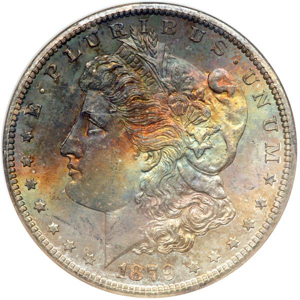 1879-S. NGC graded MS-65. Lovely rainbow toning on the obverse. Check our web site to see the color photos.