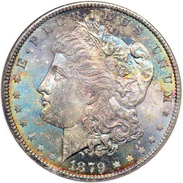 1879-S Morgan Dollar. NGC graded MS-67. A sensational gem Morgan dollar. The obverse is blanketed with dazzling multi-color toning while the reverse exhibits attractive hues about the borders as well. In an old NGC holder.