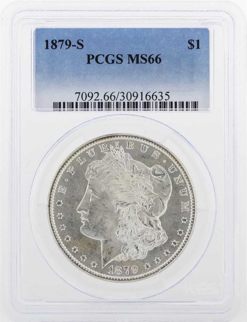One 1879-S PCGS MS66 Morgan Silver Dollar.