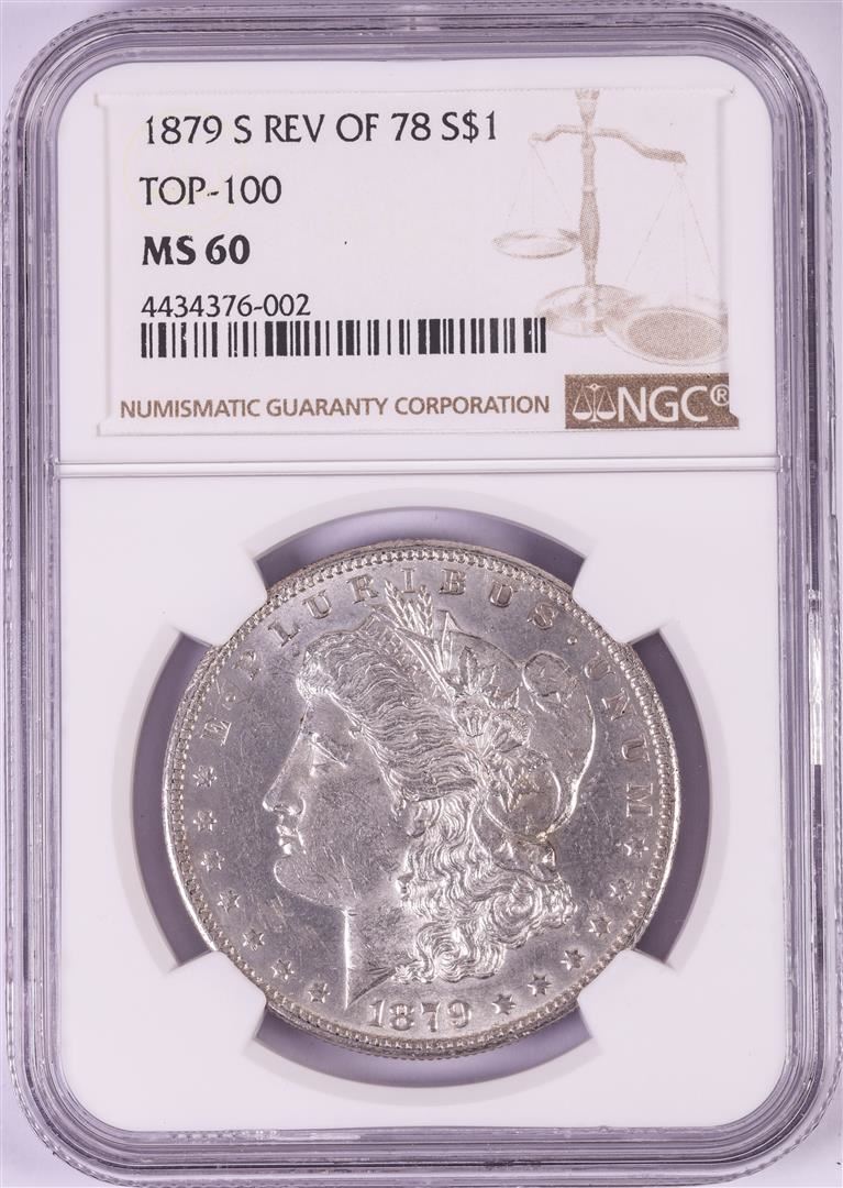One 1879-S Rev of 78 Top-100 $1 Morgan Silver Dollar Coin NGC MS60. NGC Certified.